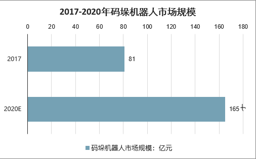 2017年码垛机器人市场规模约为81亿元,同比增长29%。未来,受利好政策推动、物流行业快速发展等因素影响,码垛机器人市场规模将进一步扩大,预计到2020年有望超165亿元。