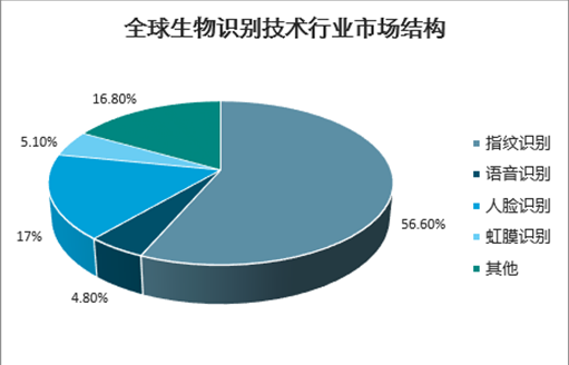 指纹识别在生物识别技术中所占的份额最高,但整体呈下降趋势,由2007年的66.9%降至2018年的56.5%,预计到2023年将下降至50.8%左右;而人脸识别则增长迅速,2018年比重达16.8%。
