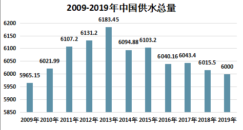 2018年我国供水总量为6015.5亿立方米,同比减少0.46%,我国供水市场已趋近饱和,进入平稳发展状态,2019年全国供水总量仍将保持6000亿立方米的水平线上。