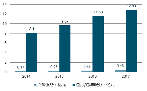 增值服务市场可分为包月/ 包年服务及点播服务(按次)两大部分,其中包月/ 包年服务预计将占增值服务市场的主要部分,点播服务由于直面在线视频、OTT的竞争,占比较小 。
