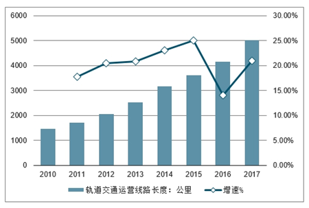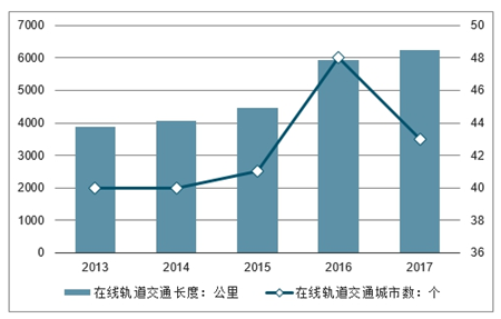 截至 2017 年,我国运营的轨道交通线路达 5022 公里,同比增长 20.9%,近五年的 CAGR 达到 19.5%;在建轨道交通的城市有 43 个,在建长度达 6246 公里。2017 年底,受内蒙古包头地铁项目被叫停以及防范地方系统性债务风险影响,发改委曾一度暂停了轨道交通建设规划审批工作。直到 2018 年 7 月,规划审批工作才重新启动 。