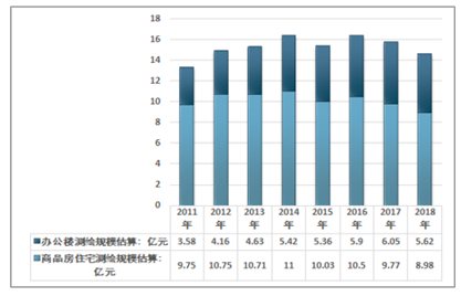 2018年我国房产测绘市场规模约14.6亿元,其中商品房住宅测绘规模约8.98亿元,办公楼及其他测绘规模5.62亿元。如下图所示: