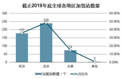 截止2019年底,欧洲有177个加氢站,其中德国拥有87个排名第一,法国拥有26个加氢站排名第二,此外法国还有34个计划中的加氢站,并有望进一步发展。亚洲共有178个加氢站,日本有114个,韩国有33个。北美加氢站数量达到74个,其中大多数仍位于加州(48个)。
