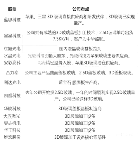 3D玻璃:热弯工艺是3D曲面玻璃独需的工艺,另外,抛光、丝印等工艺也是在弯曲后的玻璃上进行,工艺难度比2.5D、2D大很多。