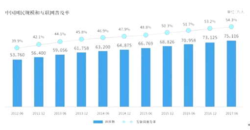 截至2017年6月,我国网民规模达到7.51亿,半年共计新增网民1992万人。互联网普及率为54.3%,较2016年底提升1.1个百分点。