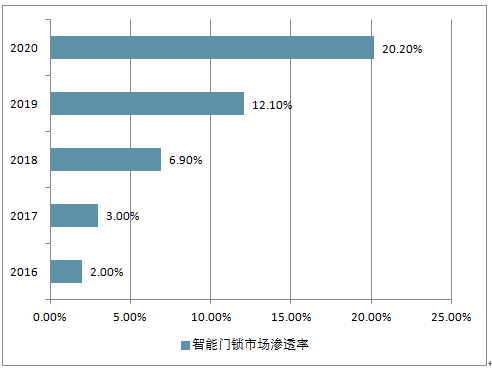 2016-2020年中国智能门锁市场渗透率走势