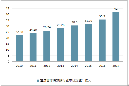 2017年中国建筑窗体隔热膜行业达到42.00亿元,较2016年同期增长18.31%。
