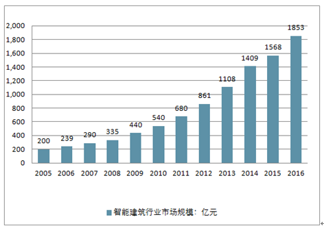 我国智能建筑行业市场在2005年首次突破200亿元之后,也以每年20%以上的增长态势发展。2012年,下游建筑行业的持续增长推动了智能建筑行业的发展,我国建筑智能市场规模达到861亿元,同比增长26.6%。2016年,我国智能建筑市场规模已经达到1853亿元,同比增长18.18%左右,继续保持较快的增长速度。