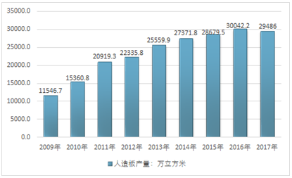 2017年我国人造板行业产量29486万立方米,同比2016年的30042.2万立方米下降了1.85%,近几年我国人造板行业产量走势如下图所示: