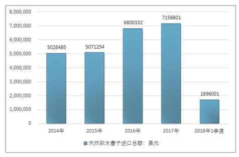 2016年我国天然软木塞子进口总额6800332美元,2017年进口总额7158801美元;2019年1季度进口总额1696001美元。