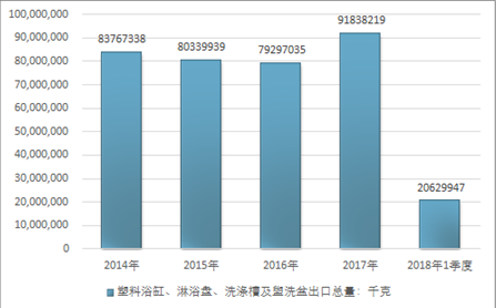 2016年我国塑料浴缸、淋浴盘、洗涤槽及盥洗盆出口总量79297035千克,2017年出口总量91838219千克;2019年1季度出口总量20629947千克。