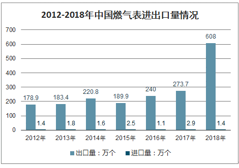 2018年我国燃气表进口量约608万台,出口量约1.4万个。