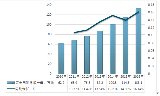 2010-2016年中国家电用彩涂板市场产量及增速情况