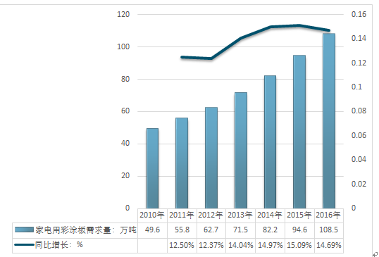 2010-2016年中国家电用彩涂板市场需求及增速情况