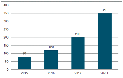 2015年,中国晾衣架行业终端市场规模约为80亿元,2016年市场规模突破100亿元,2017年达到200亿元。按照这个增长速度,预计到2020年,整个行业将形成350亿的终端市场规模。