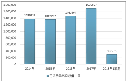 2016年我国弓弦乐器出口总量1461964只 ,2017年出口总量1696557只 ;2018年1季度出口总量302276只 。