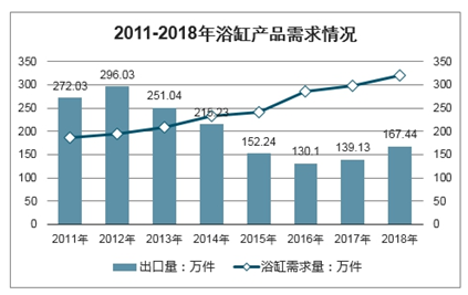 随着我国经济增长,及由此带来的居民卫浴产品消费升级,我国浴缸产品需求不断增长,特别是高端浴缸需求将会持续增长。数据显示,2018年我国浴缸产品产量约455.43万件,行业进口量约31.53万件,出口约167.44万件,国内浴缸产品需求量约319.52万件。