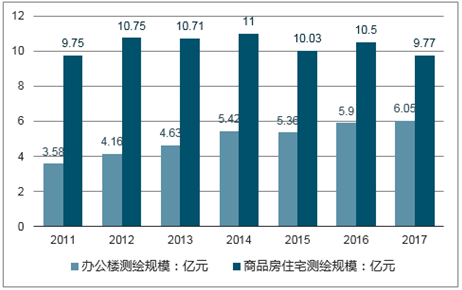 2017年我国房产测绘市场规模约15.82亿元,其中商品房住宅测绘规模约9.77亿元,办公楼及其他测绘规模6.05亿元。