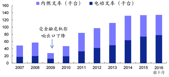 我国作为叉车行业产销第一大国,叉车产品的海外出口数量逐年提升,并且结构也在改变, 电动叉车出口数量增加,而内燃叉车的出口数量逐年减少。在 2015 年电动叉车的出口数量 首次超过内燃叉车,目前占比达到 58.6%。随着电动叉车在技术性能上的提升, 电动叉车的出口数量将保持 20%的较高速度增长,逐步完成对内燃叉车的替代。