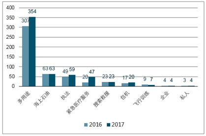 2017年年末,中国内地涡轮直升机总数达581架,同比增长17.4%。其中执行多用途任务的机队354架(包括观光游览、航空摄影与测绘、陆上油气和矿藏勘探、航空护林、电力巡查等,执行这些任务的直升机一般有较强的通用性),同比增长15%;执行海上石油任务的机队63架,与2016年持平。直升机紧急医疗业务获得显著增长,在2017年增幅达135%,反映出政府部门对于紧急医疗业务的支持。