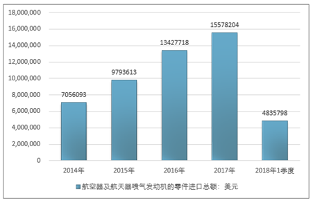 2016年我国航空器及航天器喷气发动机的零件进口总额13427718美元,2017年进口总额15578204美元;2019年1季度进口总额4835798美元。