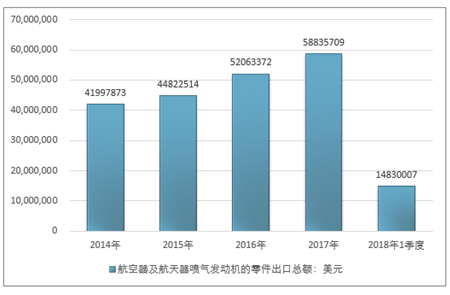 2016年我国航空器及航天器喷气发动机的零件出口总额52063372美元,2017年出口总额58835709美元;2019年1季度出口总额14830007美元。