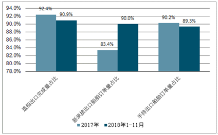 2017-2018年中国造船三大指标中出口所占比例