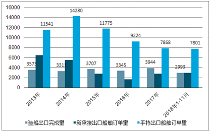 2013-2018年中国造船出口三大指标情况