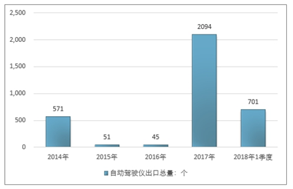 2016年我国自动驾驶仪出口总量45个 ,2017年出口总量2094个 ;2018年1季度出口总量701个 。
