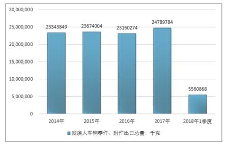 2016年我国残疾人车辆零件、附件出口总量23160274千克 ,2017年出口总量24789784千克 ;2019年1季度出口总量5560868千克 。