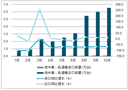 2019年1-10月中国地中衡、轨道衡累计进出口数量及增速趋势图