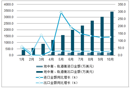 2019年1-10月中国地中衡、轨道衡累计进出口金额及增速趋势图