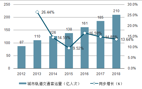 从我国城市轨道交通客运量来看,随着近年来城市轨道交通运营线路长度的增加以及城市人口的增多,城轨交通客运量在不断上升。根据数据,2018年末我国内地城轨交通累计完成客运量210亿人次,增幅为13.65%。随着一二线城市人口增多,客运密度加大,同时新增投运线路里程维持在高位。