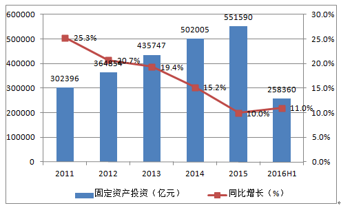 2016年上半年,全国固定资产投资(不含农户)258360亿元,同比名义增长9.0%(扣除价格因素实际增长11.0%),增速比一季度回落1.7个百分点。其中,国有控股投资91089亿元,增长23.5%;民间投资158797亿元,增长2.8%,占全部投资的比重为61.5%。分产业看,第一产业投资7460亿元,同比增长21.1%;第二产业投资101702亿元,增长4.4%;第三产业投资149198亿元,增长11.7%,其中,基础设施投资(不含电力、热力、燃气及水生产和供应业)49085亿元,增长20.9%。从到位资金情况看,上半年到位资金282443亿元,同比增长8.0%。其中,国家预算资金增长21.8%,国内贷款增长12.4%,自筹资金增长1.4%,利用外资下降7.2%。上半年,新开工项目计划总投资240202亿元,同比增长25.1%。从环比看,6月份固定资产投资(不含农户)增长0.45%。