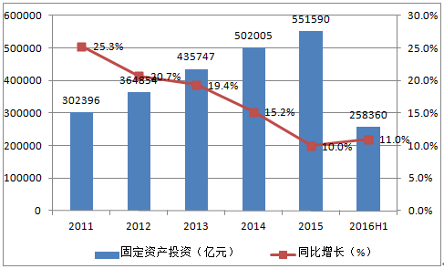 2011-2016H1中国固定资产投资及增长速度