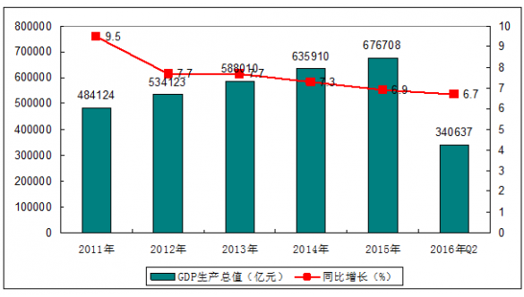 图表:2010-2016年中国GDP增长走势图(单位:万亿元,%)