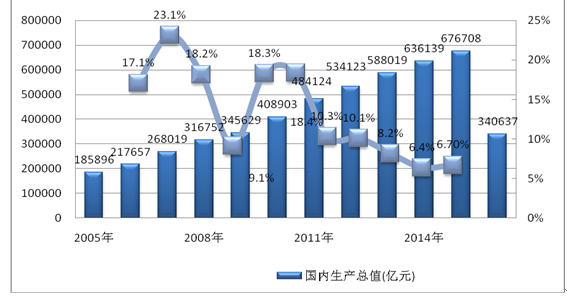 2015年,我国国内生产总值达到676708亿元。2016年上半年,国内生产总值为340637亿元。