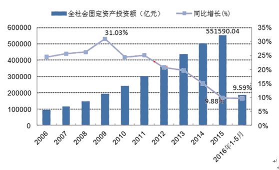 2006-2016 年 1-5 月全社会固定资产投资及增速