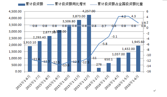 2015年6月-2016年6月钢铁行业固定资产投资变化情况(单位:亿元,%)