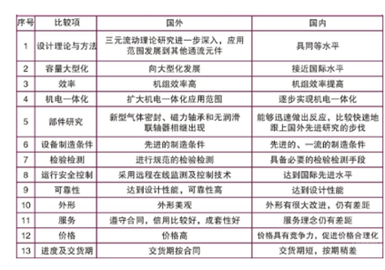 我国离心压缩机制造业总体上与国外尚存在一些差距,主要差距在研究开发投入和产品质量等方面,根据产品制造、供应的一些情况,现将国内外压缩机产品的差距整理列于下表。