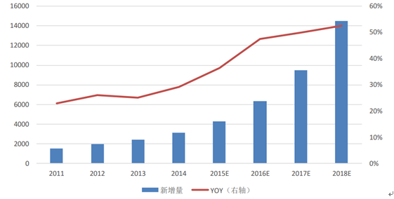 AGV 应用领域非常广泛,但是,我国各行业应用 AGV 总体规模并不大,对应用市场来说仍处 于发展初期,后续发展空间巨大。从国内主要企业的年出货量来看,基本上都是 1000 台/年以下。2014 年国内 AGV 新增量 3150 台,同比增长 29.15%,新增市场中,超过 70%是来自国产品牌, 预计 2018 年新增量可达 1.45 万台,增速有望超过 50%