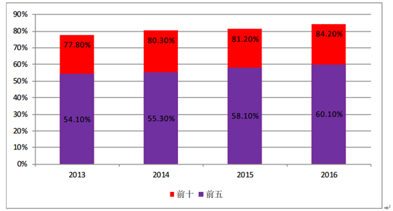 前五名风电机组制造企业市场份额由 2013 年的 54.1%增加 到 2016 年的 60.1%,排名前十的风电机组制造企业市场份额由 2013 年的 77.8%增长到 2016 年的 84.2%。