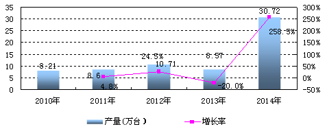 2014年中国大气污染防治设备产量高达30.72万台,比去年同期增长了258.4%。2010-2012年中国大气污染防治设备产量呈不断增长态势,2013年产量相较于前一年下降了20%。2014年大气污染防治设备产量暴增,达到了258.4%的涨幅。