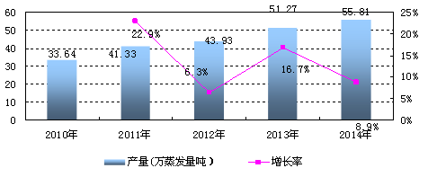 2014年我国工业锅炉产量为55.81万蒸发量吨,与上一年相比增长8.9%。据近五年的统计数据,我国工业锅炉产量近几年呈增长态势。