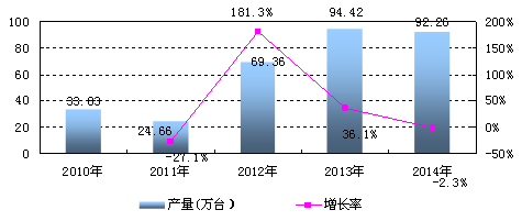 2014年我国铸造机械产量为92.26万台,与上一年相比下降2.3%。据近几年的统计数据来看,我国铸造机械产量呈波动增长态势,2012年的产量急剧上升,增长率达到181.2%,自2013年开始,铸造机械产量保持在高位,都超过90万台。