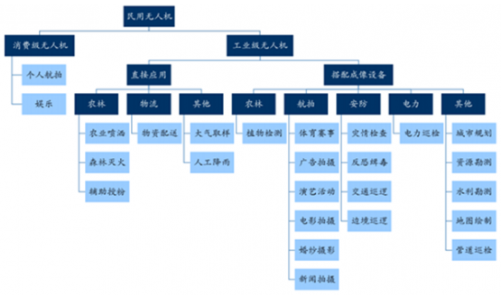 目前,民 用无人机包含消费级无人机和工业级无人机。消费级无人机主要应用在航拍领域;工业无 人机在电力、物流、农业、林业及安防等领域,大多数可以融入计算机的分析计算和人的 感知,辅助人们更为直观和高效地洞悉大数据背后的信息,成为大数据的采集器,应用范 围不断扩大。