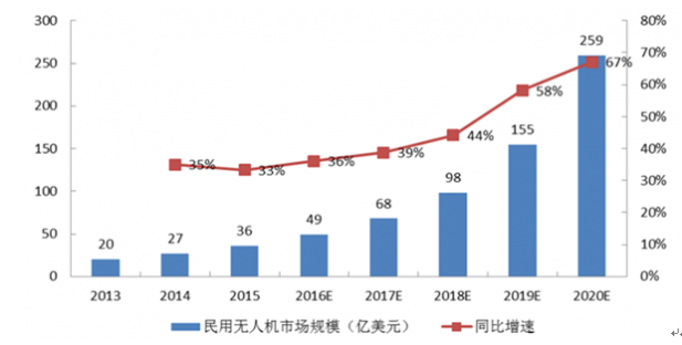 全球无人机2013年市场规模20亿美元,2014年市场规模达到27亿美元,同比增长35%;2015年市场规模36亿美元,同比增长33%。预计2020年全球无人机市场规模将达到259亿美元,年均复合增长率达到42%。