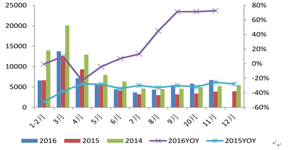 挖掘机销量和增速(2014年- - 2016年)