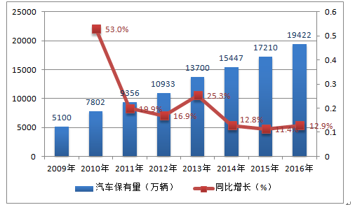 图表24:2009-2017年我国移动电话户数及增速(单位:万户,%)