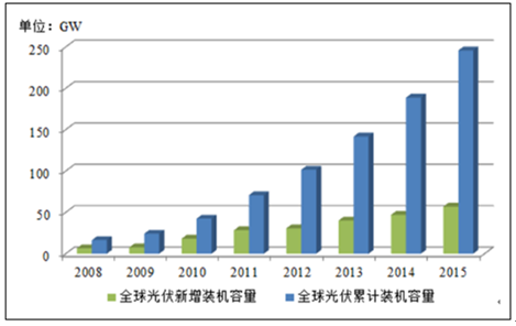 近年来,随着各国对可再生能源发展的重视,光伏发电成为世界新能源领域的一大亮点。自 2006 年以来,全球太阳能光伏发电市场一直处于持续、快速地发展过程中。据统计,2015 年全球光伏新增装机容量实现 57GW, 累计装机容量达 245.8GW, 较 2014 年增长幅度达到 21.28%。 近几年,受益于中国、日本、美国等体量较大的光伏市场的持续升温,全球太阳能光伏新增装机容量呈现上升态势,光伏行业目前整体处于健康稳定发展阶段。